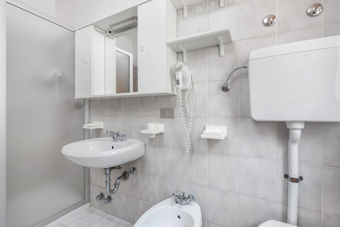 L'appartamento è composto da una camera da letto con letti separabili e un divano letto matrimoniale, un bagno con doccia e asciugacapelli, cucina con soggiorno (completa di elettrodomestici, stoviglie, biancheria da cucina) e divano letto, balcone. Tra i comfort: wi-fi, bollitore, lavastoviglie e TV-Sat con 6 canali Sky (visibili da metà giugno a metà settembre).